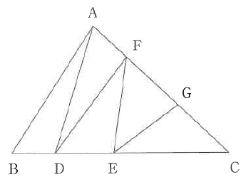 図は、三角形ABCを面積の等しい5つの三角形に分けたものです。BCの長さが12cmのとき、DEの長さは cmです。