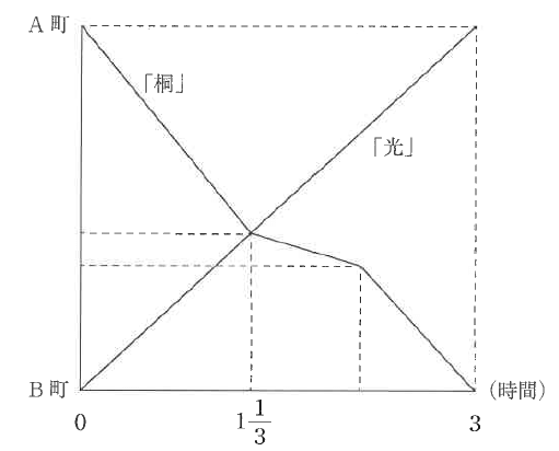 一定の速さで流れている川にそって川上のA町から川下のB町まで36kmあります。静水時での速さが等しい2そうの船「桐」と「光」があります。「桐」はA町からB町に向かい、「光」はB町からA町に向かい同時に出発したところ1時間20分後に2そうの船はすれちがい、すれちがってから1時間40分後に「光」はA町に着きました。「桐」は2そうの船がすれちがった直後にエンジンが止まってしまったため、しばらく川に流されましたが、その後エンジンがなおったため、再びもとの速さでB町に向かったところ、「光」がA町に到着したのと同時に「桐」もB町に着きました。図は2そうの船の位置と時間の関係を表しています。このとき、次の問いに答えなさい。
