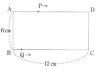 図のように、縦6cm、横12cmの長方形ABCDがあります。点Pは秒速4cmの速さで点Aを出発し、辺AD上を動きます。点Dに着いたら、点Aに戻ります。点Aに着いたら再び点Dに向かい、Aまで戻ります。点Qは点Bを出発し、辺BC上を動きます。点Cに着いたら、点Bに戻ります。点Pと点Qは同時に出発し、点Pは点Qが点Bに戻ってきたところで動くことをやめます。