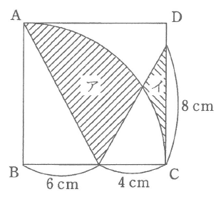 引用元:逗子開成中学校 2020年度入学試験問題(第1回) 算数 問2-(4)1辺の長さが10cmの正方形ABCDの中に、次の図のように頂点Bを中心とするおうぎ形と2本の直線を描きました。斜線部アと斜線部イの面積の差を求めなさい。ただし、円周率は3.14とします。