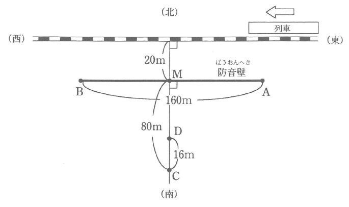 次の図のように東西にのびる線路があり、線路と平行に20mの距離を保ちながらAB間に防音壁(ぼうおんへき)があります。防音壁は長さ160m、高さ10mの長方形の形をしています。また、防音壁の南側からは、線路を走る列車は防音壁にかくれて見えなくなります。なお、図において点MはABの真ん中の点で、CM間の距離は80mです。また、列車Xと列車Yはそれぞれ矢印の方向(東から西)に向かって一定の速さで走っています。