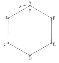 図のような正六角形ABCDEFがあり、その頂点上を動く点Pがあります。今からサイコロを何回か投げ、点Pはサイコロの出た目の数だけ反時計回りに頂点の上を移動していきます。最初、点PはAの位置にいますが、その後はサイコロを投げて止まった位置から動いていきます。このとき、次の各問いに答えなさい。
