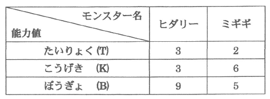 ズトシくんは、対戦相手と互いにモンスターを出して戦うゲームで遊んでいます。このゲームのモンスターは、種類によって決まった3つの能力値(たいりょく、こうげき、ぼうぎょ)を持っています。さらにモンスターの能力値にはボーナス値もあり、たいりょく、こうげき、ぼうぎょのそれぞれに0、1、2、3のどれかが割りふられます。ズトシくんはゲーム大会に出場するために、2種類のモンスターをたくさんつかまえることにしました。次の表は、ボーナス値が加算される前のモンスターの能力値です。