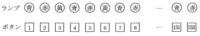 図のように3色のランプが、青⇒赤⇒黄の順に152個並んでいます。それぞれのランプの真下には、それらのランプを点灯させるボタンがあり、ボタンには1から152までの整数が順に書かれています。